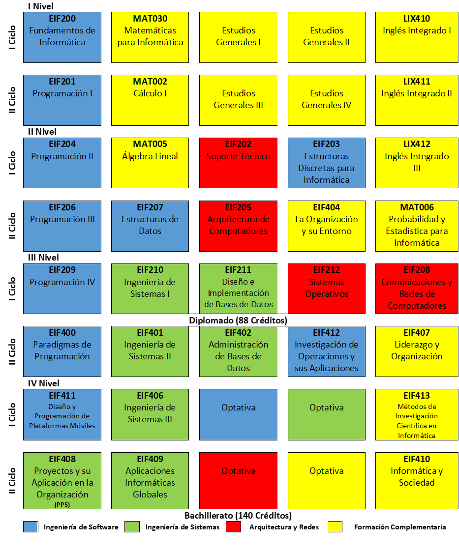 En el caso de grado bachillerato, el plan lo componen 41 cursos y 140 créditos, incluidos los cursos del diplomado, para una duración de cuatro años.